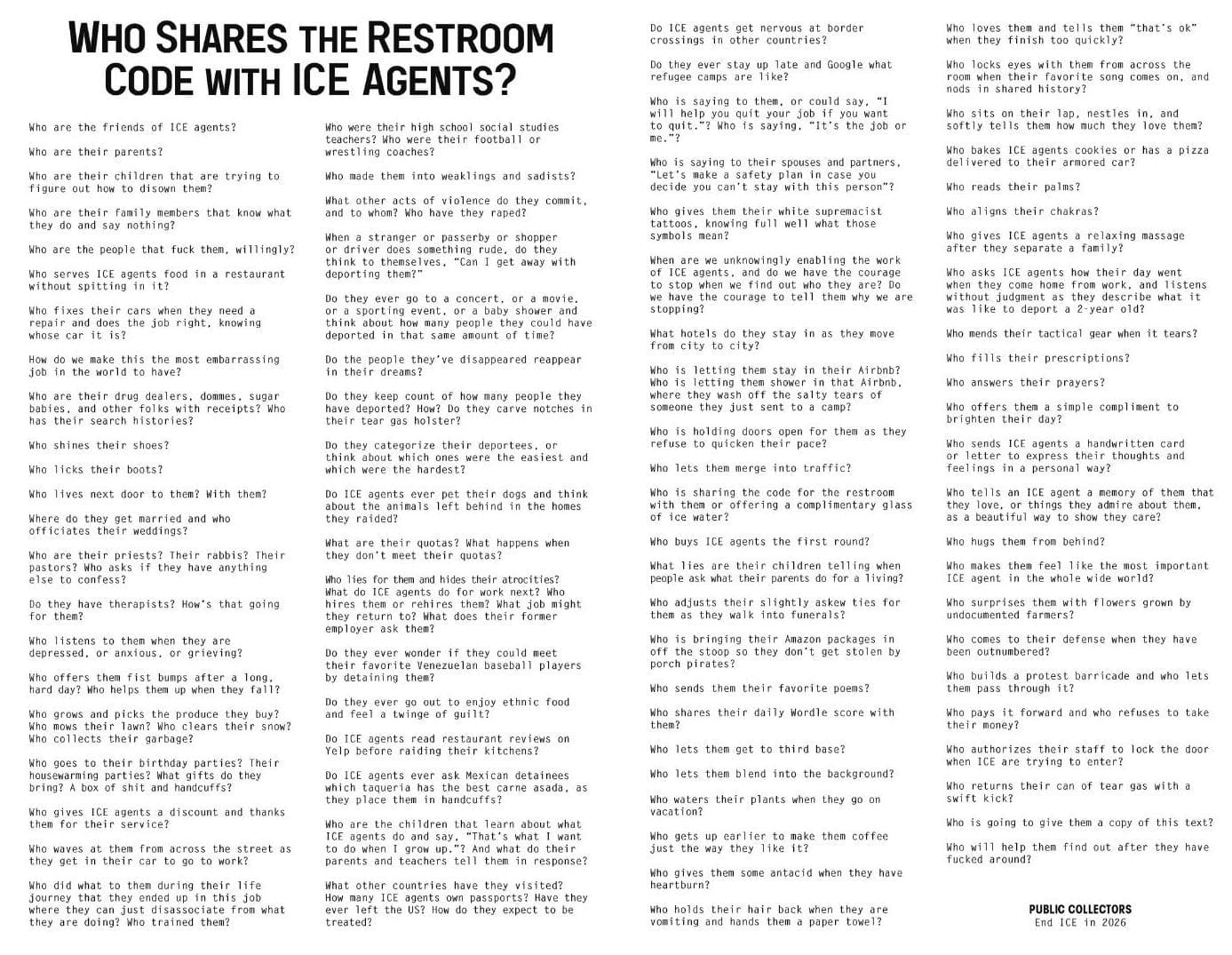 Back to that present, connecting Venezuela, Minneapolis, and Greenland, Nikhil Pal Singh argues that Trump does not transcend history, as most neoliberals would like to believe, but rather affirms it through America's "Homeland Empire." "Reversing this will require something more than a return to normalcy, particularly as the American security state tends to be accretive–recent history suggests that it only metastasises." We can't ignore the growing cancers of the past, nor can we turn our heads away from the deluge of images that aim to overwhelm us into inaction. We can't return to normal when military and policing are and have always been the norm, when everything else is stripped away and sold for slop. We have to remain mischievous, to remain human, to remember.